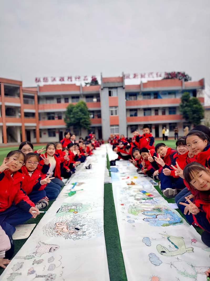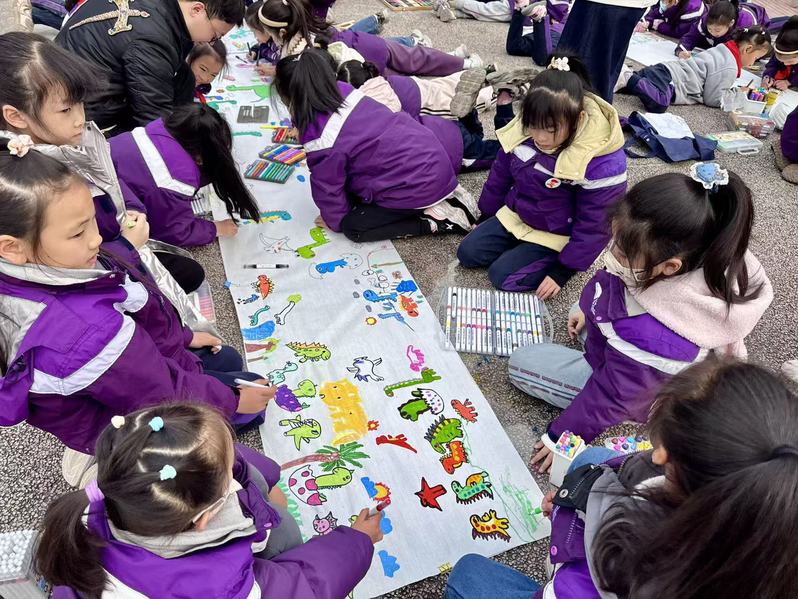 学校的操场变身“露天画室”,千余名中小学生手执画笔,在近百米长的画布上共绘心中“恐龙王国”,让恐龙在科学与艺术的共创中真正的“活”起来。