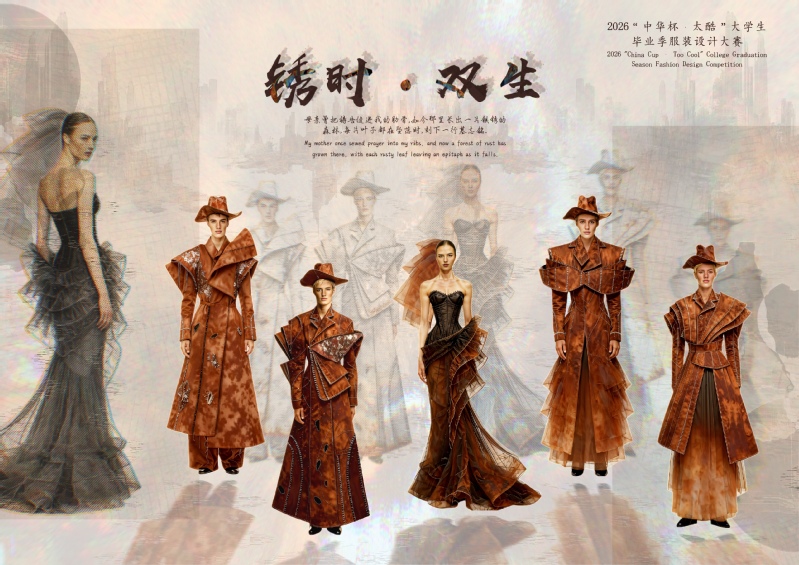 作品《锈时·双生》以“时间与共生”为主题,将铁锈氧化形成的斑驳肌理与渐变色彩作为核心视觉符号,借老物件锈蚀痕迹与织物磨损纹路,表达时光流逝的痕迹与岁月沉淀的厚重感。设计以“双生”对立统一为创意脉络,融合新与旧、完整与破碎、柔软与坚硬的多重对比关系,并运用解构手法对衣片进行切割重组,表现锈迹自然侵蚀的生长形态,展现时光刻痕之下的诗意审美。